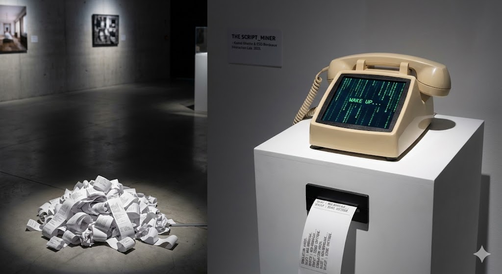 Le Concept Dans un futur où la créativité humaine est devenue obsolète, cette machine « mine » les vestiges de nos imaginaires perdus. « THE SCRIPT_MINER » se présente sous la forme d’un terminal téléphonique rétro-futuriste, agissant comme une foreuse dans les strates sédimentaires des réseaux de neurones artificiels (IA).